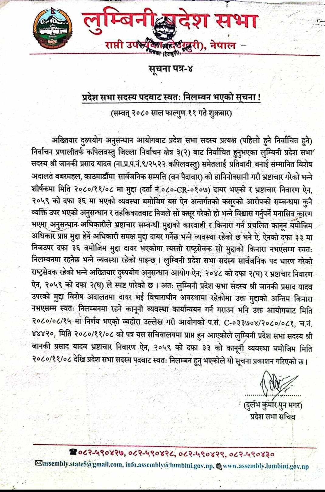 तत्कालीन गौतमबुद्ध साझेदारी वनका अध्यक्षरहेका यादवसहित १९ जनाविरुद्ध फागुन ८ गते अख्तियारले भ्रष्टाचार मुद्दा चलाएको हो । प्रदेशसभाका सचिव दुर्लभकुमार पुनमगरद्धारा जारी सूचनामा भनिएको छ, ‘सचिवालयमा प्राप्त हुन आएकोले लुम्बिनी प्रदेशसभा सदस्य जानकीप्रसाद यादव भ्रष्टाचार निवारण ऐन, २०५९ को दफा ३३ को कानूनी व्यवस्था यही फागुन ८ गतेदेखि प्रदेशसभा सदस्य पदबाट स्वतः निलम्बन हुनु भएकाले यो सूचना प्रकाशन गरिएको छ ।’ सचिवालयको विज्ञेप्तीमा उल्लेख छ ।