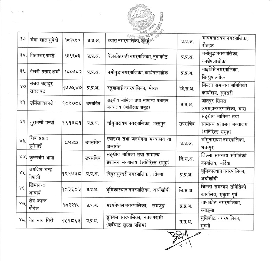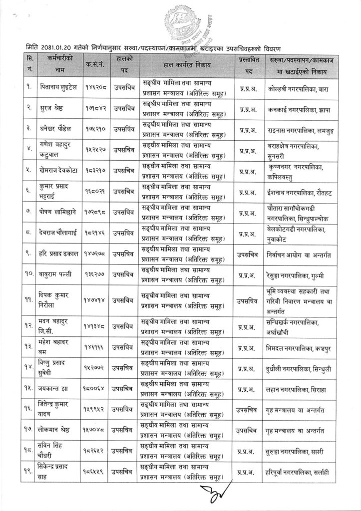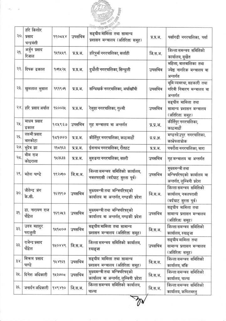सरुवा तथा पदस्थापन भएका र कामकाजमा खटाइएका उपसचिवहरुमध्ये केहीले जिल्ला समन्वय समितिमा जिम्मेवारी पाएका छन् भने केही विभिन्न मन्त्रालयहरुमा पनि सरुवा भएका छन् ।