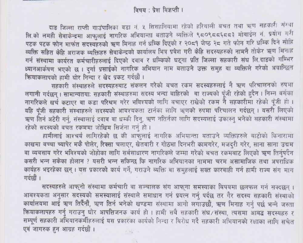 ‘सामान्यतया ः सहकारी संस्थाहरुमा सदस्य भन्दा बाहिरको वा राज्यको पूँजी रहेको हुदैन् । निम्न वर्गका नागरिकले खर्च कटाएर वा कडा परिश्रम गरेर भविष्यको लागि बचाएर राखेको रकम नै सहकारीमा रहेको पुँजी हो । यहि पुँजी सहकारी संस्थाहरुले सदस्यको आवश्यकता टार्नका लागि ऋणको रुपमा परिचालन गर्दछन् । यसरी लिएको ऋण तिर्न अटेरी गर्नु, संस्थालाई दवाव वा धम्की दिनु, ऋण नतिर्नका लागि सदस्यलाई उकास्नु भनेको सहकारी संस्थामा रहेको सदस्यको वचत रकममा जोखिम सिर्जना गर्नु हो ।’ विज्ञप्तीमा भनिएको छ(‘नागरिक अभियानका नाममा चरम असामाजिक तथा अपराधिक कार्यहरु भइरहेकोले यसप्रकारको कार्य गर्ने, गराउने व्यक्ति वा समुहलाई सख्त कारवाही गर्न राज्यसंग माग गर्दछौं ।’