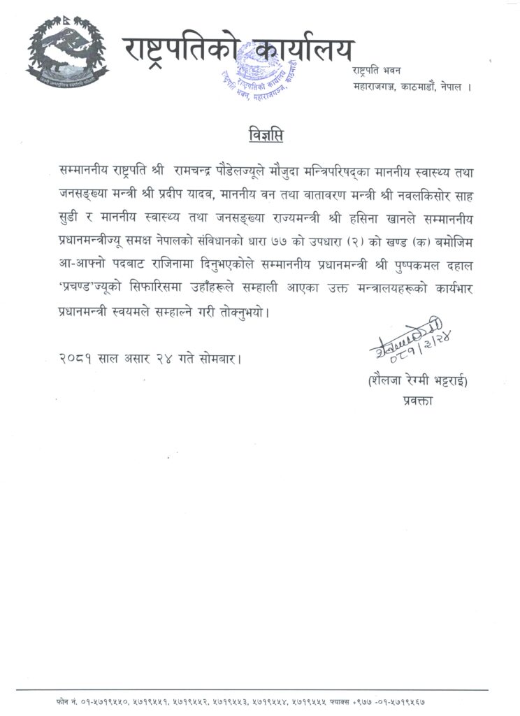 स्वास्थ्य तथा जनसङ्ख्या मन्त्री प्रदीप यादव, वन तथा वातावरण मन्त्री नवकिशोर साह सुडी र स्वास्थ्य तथा जनसङ्ख्या राज्यमन्त्री हसिना खानले पदबाट राजीनामा दिएपछि सोमबार राष्ट्रपति पौडेलले उक्त मन्त्रालयको कार्यभार प्रधानमन्त्री स्वयमले सम्हाल्ने गरी तोकेका हुन् ।