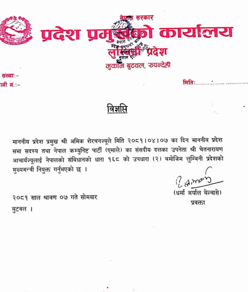 दाङ, ७ साउन । लुम्बिनी प्रदेशको मुख्यमन्त्रीमा नेकपा एमाले संसदीय दलका उपनेता चेतनारायण आचार्य नियुक्त भएका छन् ।