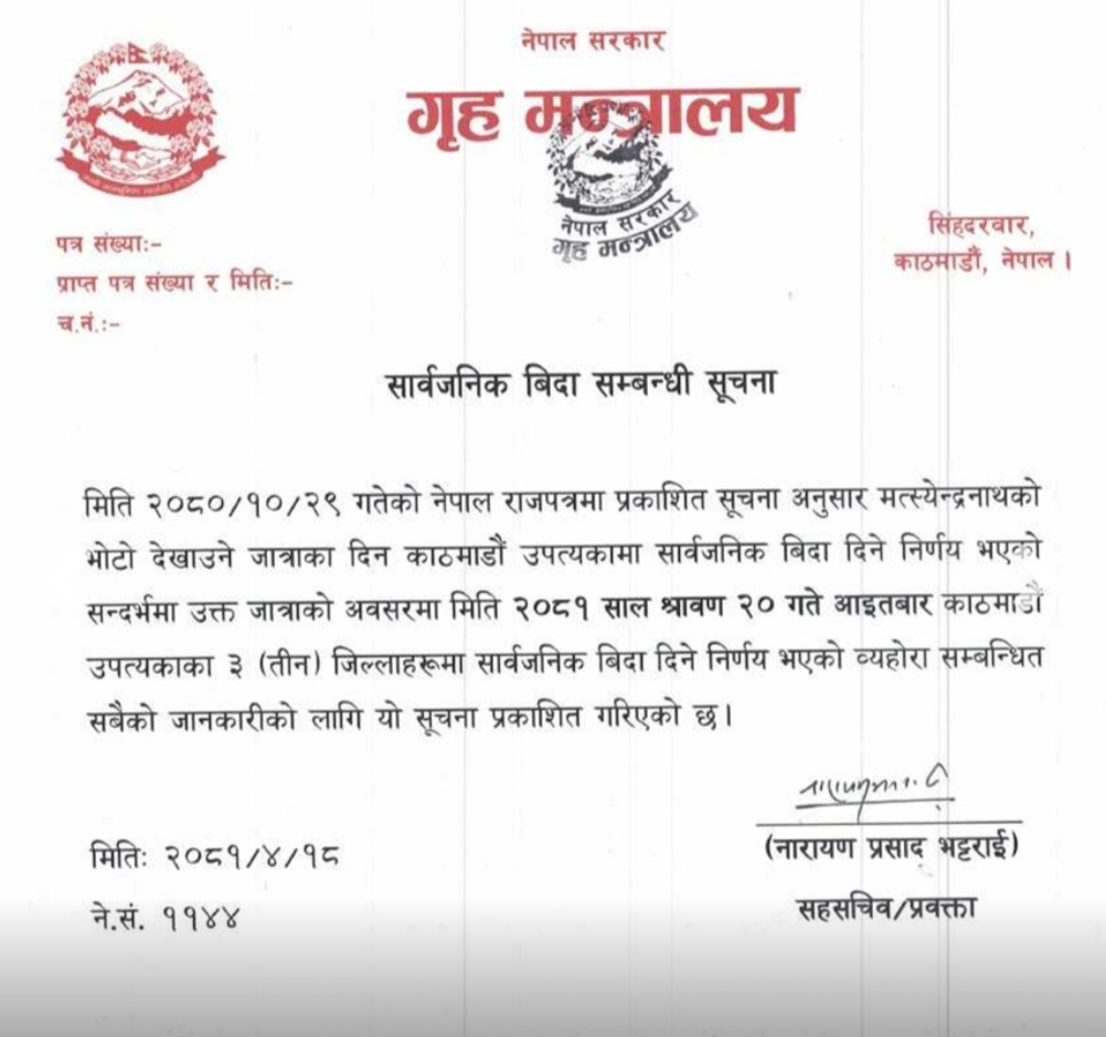 गृह मन्त्रालयले शुक्रबार एक सूचना जारी गर्दै मत्स्येन्द्रनाथको भोटो देखाउने जात्राका दिन काठमाडौं उपत्यकामा सार्वजनिक विदा दिने निर्णय गरेको बताएको हो ।
