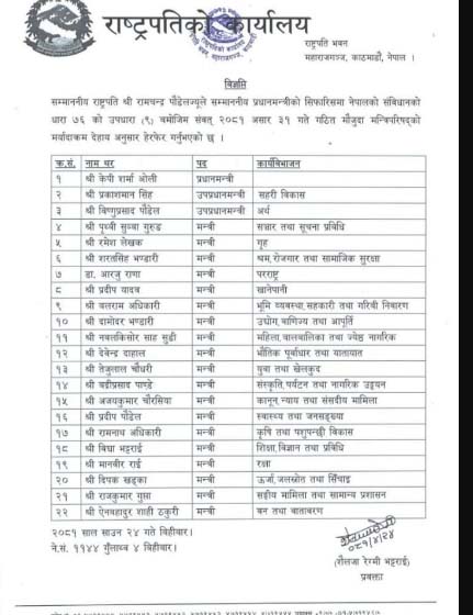 काठमाडौँ,२४ साउन । राष्ट्रपति रामचन्द्र पौडेलले मन्त्रीपरिष्को वरीयतामा हेरफेर गरेका छन् । राष्ट्रपति पौडेलले प्रधानमन्त्री केपी शर्मा ओलीको सिफारिसमा मौजुदा मन्त्रिपरिषद्‍मा वरीयता हेरफेर गरेका हुन् ।