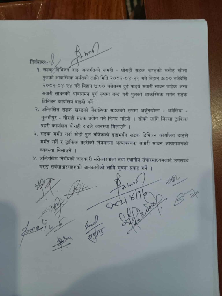 मर्मत अवधि भरि पुलमा सवारी आवागमन नहुने भएकाले वैकल्पिक मार्गको रूपमा अर्जुनखोला–अमेलिया–तुलसीपुर–घोराही सडक प्रयोग गर्न ट्राफिक प्रहरीले अनुरोध गरेको छ। ट्राफिक व्यवस्थापन र यात्रु सुरक्षाका लागि आवश्यक तयारी गरिएको जनाइएको छ।