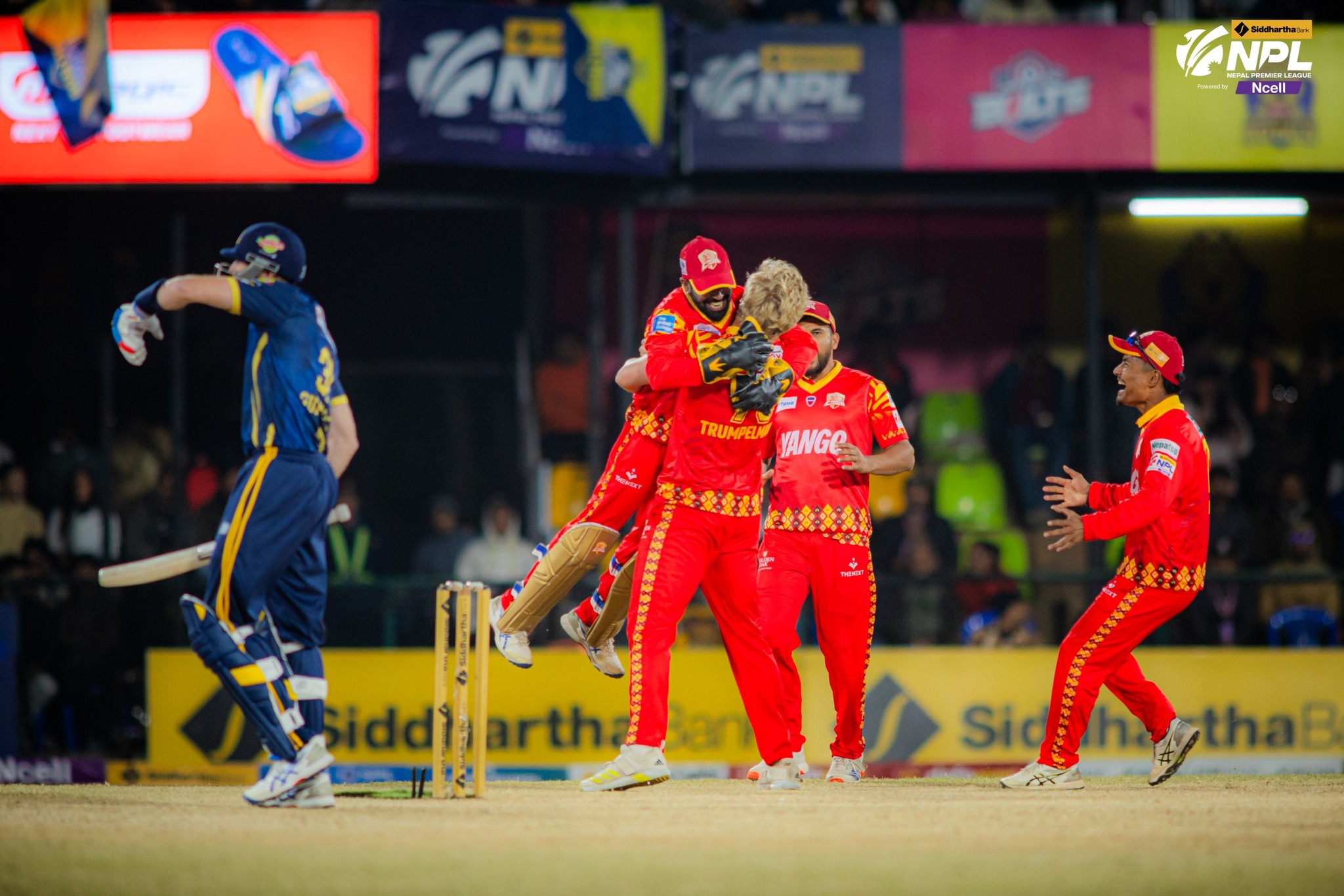 काठमाडौँका सन्तोष यादवले २ विकेट लिए भने कप्तान करण केसी, सन्नी पटेल, शाहब आलम र रासिद खानले एक–एक विकेट लिए।