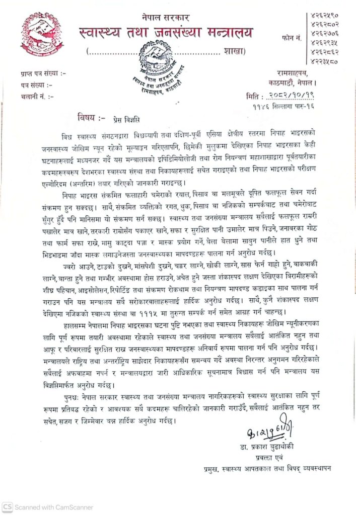 छिमेकी मुलुकमा देखिएको निपाह भाइरसका केही घटनालाई मध्यनजर गर्दै मन्त्रालयको इपिडिमियोलोजी तथा रोग नियन्त्रण महाशाखाद्वारा पूर्वतयारीका कदमस्वरूप देशभरका स्वास्थ्य संस्था तथा निकायलाई सचेत गराइएको पनि विज्ञप्तिमा उल्लेख छ ।