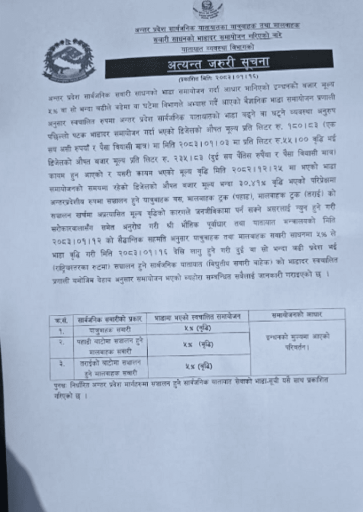 सूचनाअनुसार अन्तरप्रदेश यात्रुवाहक सवारी, पहाडी मार्गका मालवाहक तथा तराईका मालवाहक सवारीमा समान ५/५ प्रतिशतले भाडा वृद्धि गरिएको छ।