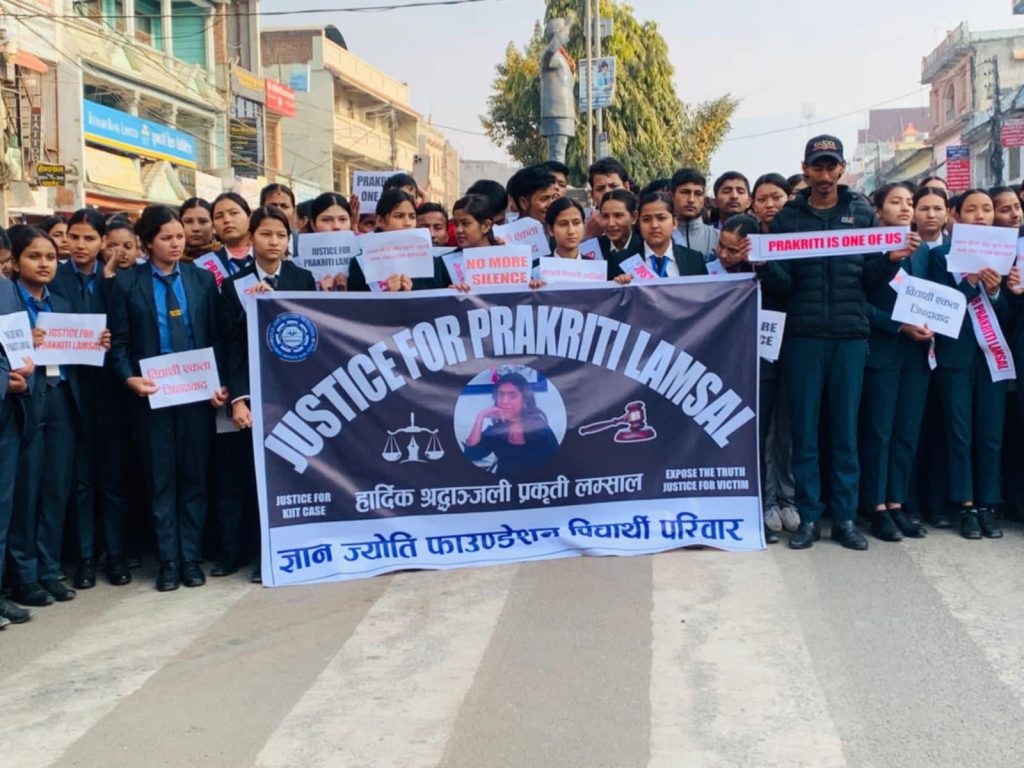 भारतको ओडिसामा रहेकाे कलिंगा इन्स्टिच्यूट अफ इन्डिस्ट्रियल टेक्नोलोजी (केआईआईटि) को छात्राबासमा मृत भेटिएकी नेपाली विद्यार्थी प्रकृति लम्सालको न्यायको माग गर्दै शान्तिपूर्ण र्याली र काेणसभा गरेका छन ।