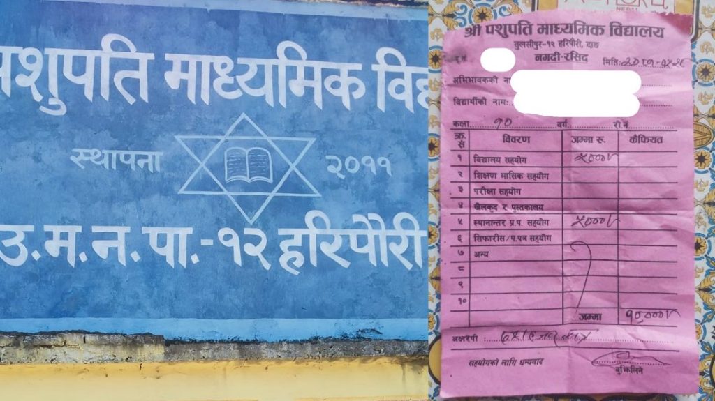 विद्यालय सहयोगको नाममा विद्यालयले शुल्क असुल्ने गरेको अभिभावकहरुले बताएका छन । सरकारी स्कुलमा पढाउदा पैसा लाग्दैन भनेको त सरकारीले पनि बोडिङ जस्तो पैसा अशुल्न थाले पछि कसरी छोराछोरी पठाउनु एकरु अभिभाकले भने, तुलसीपुरको पशुपति मावि हरीपौरीले सर्टिफिकेटका नाममा, भर्नाका नाममा र सहयोगका नाममा विद्यार्थीसँग चर्को रकम लिइरहेको छ।