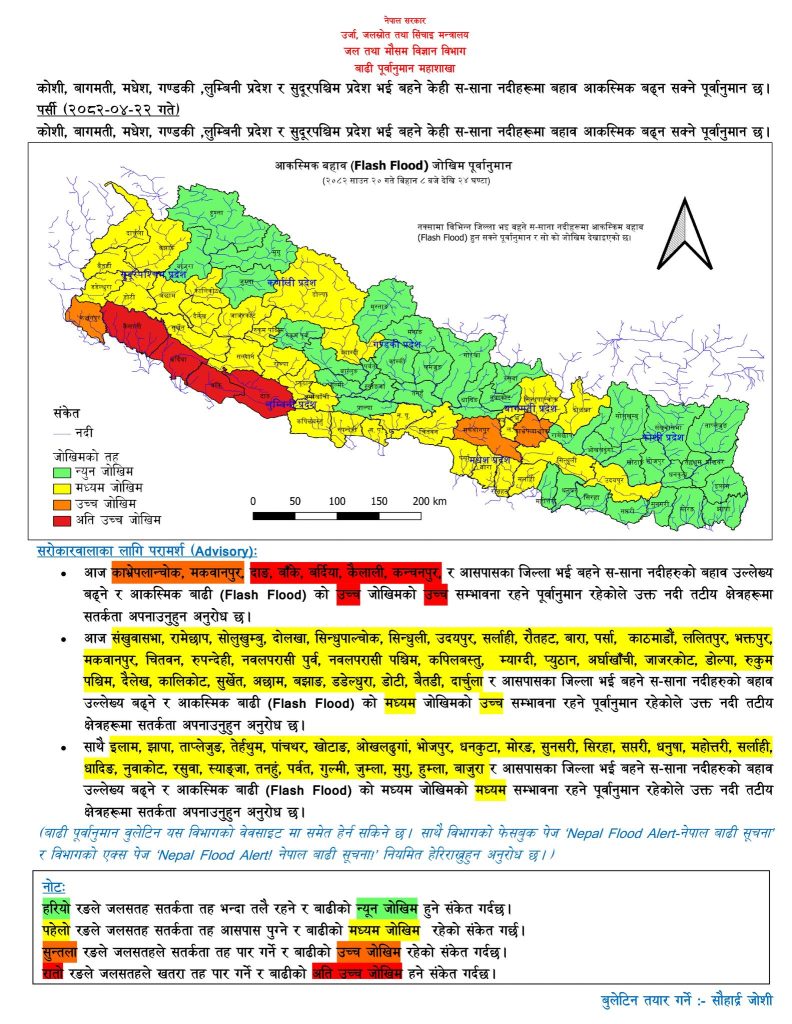 मंगलबार काभ्रेपलान्चोक, मकवानपुर, दाङ, बाँके, बर्दिया, कैलाली, कञ्चनपुरलगायत स्थानहरूमा आकस्मिक बाढीको उच्च सम्भावना रहेकोले स्थानीयवासी, यात्रु र सम्बन्धित निकायहरूलाई विशेष सतर्कता अपनाउन भनिएको छ।