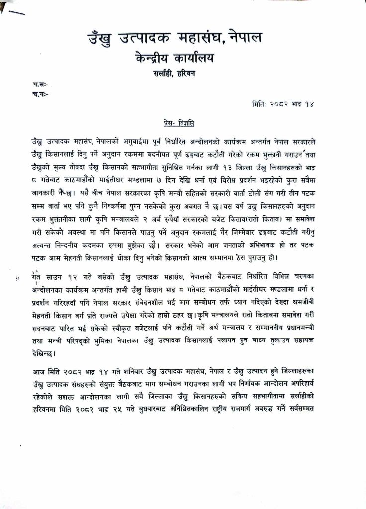 बैठकपछि जारी विज्ञप्तिमा भनिएको छ, “माग सम्बोधन गराउन थप निर्णायक आन्दोलन अपरिहार्य भएकाले सशक्त आन्दोलनका लागि सबै जिल्लाका उखु किसानहरूको सक्रिय सहभागितामा सर्लाहीको हरिवनमा २५ गते बुधबारबाट अनिश्चितकालीन राष्ट्रिय राजमार्ग अवरुद्ध गर्ने सर्वसम्मत निर्णय गरिएको छ। सो क्रममा उत्पन्न हुने प्रतिकूल वातावरणको जिम्मेवारी नेपाल सरकार, अर्थ मन्त्रालय र प्रधानमन्त्री तथा मन्त्रिपरिषद्को हुनेछ।”