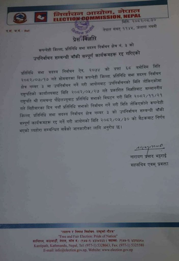 काठमाडौँ,३० भदौ । आगामी कार्तिक १७ गते सञ्चालन हुने तय भएको रूपन्देही–३ क्षेत्रको उपनिर्वाचन रद्ध गरिएको छ। निर्वाचन आयोगले सोमबार विज्ञप्ति जारी गर्दै उपनिर्वाचनको सम्पूर्ण कार्यक्रम रद्द भएको जानकारी दिएको हो।