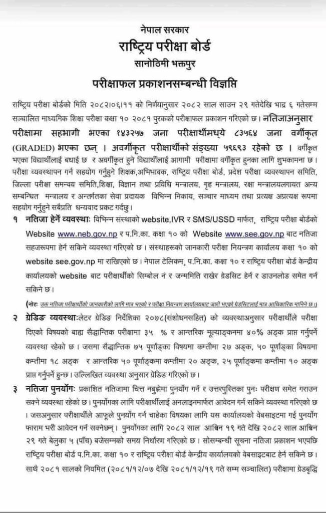 काठमाडौं,११ असोज । एसईई पूरक परीक्षाको नतिजा सार्वजनिक भएको छ । राष्ट्रिय परीक्षा बोर्डले शनिबार प्रकाशित गरेको नतिजाअनुसार ८३ हजार ५६४ परीक्षार्थी उत्तीर्ण भएका छन् ।
