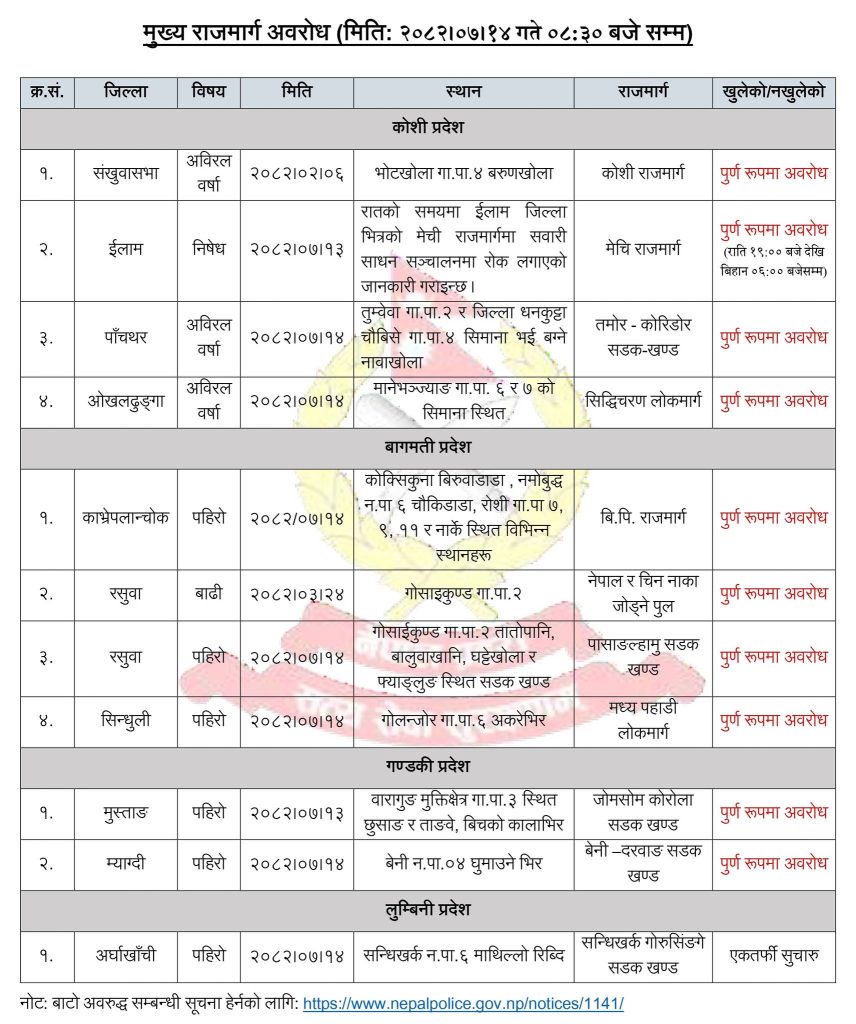 काठमाडौ,१४ कार्तिक । लगातारको वर्षाका कारण देशभरका विभिन्न राजमार्गहरूमा बाढी र पहिरोका घटना बढेका छन्, जसका कारण आवागमन ठप्प भएको छ। नेपाल प्रहरीले जारी गरेको सूचनाअनुसार हाल देशभर १० राजमार्ग पूर्ण रूपमा अवरुद्ध छन् भने एक सडकखण्ड एकतर्फी रूपमा सञ्चालनमा छ।