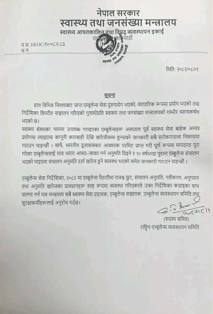 सूचनामा भनिएको छ, ‘एम्बुलेन्स पैठारीमा राजस्व छुट, सञ्चालन अनुमति, नवीकरण, अनुगमन तथा अनुमति खारेजसम्बन्धी प्रावधानहरू २०८२ को निर्देशिकामा स्पष्ट रूपमा समावेश भएकाले सबै एम्बुलेन्स सञ्चालक, व्यवस्थापन समिति, स्वास्थ्य सेवा प्रदायक तथा सरोकारवालाले यसलाई कडाइका साथ पालना गर्नुपर्नेछ।’