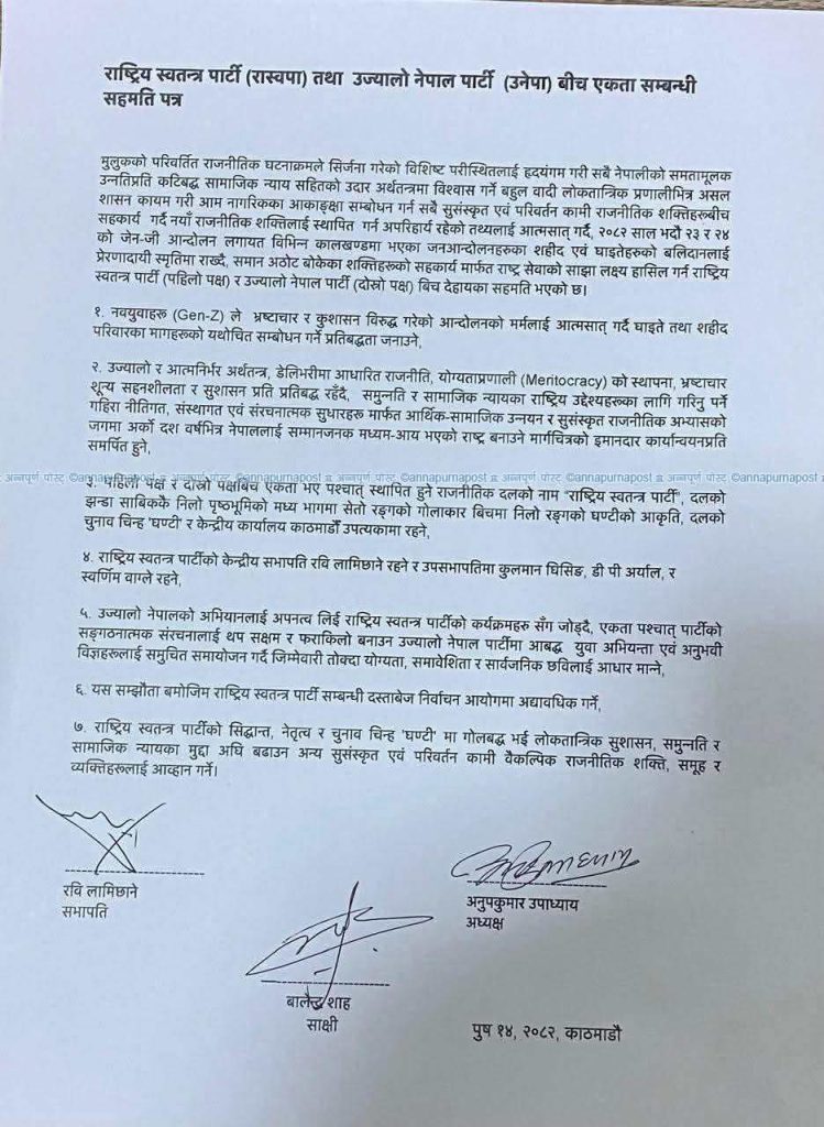 सहमतिको चौथो बुँदामा राष्ट्रिय स्वतन्त्र पार्टीको केन्द्रीय सभापति रवि लामिछाने रहने तथा उपसभापतिमा कुलमान घिसिङ, डीपी अर्याल र स्वर्णिम वाग्ले रहने उल्लेख गरिएको छ।