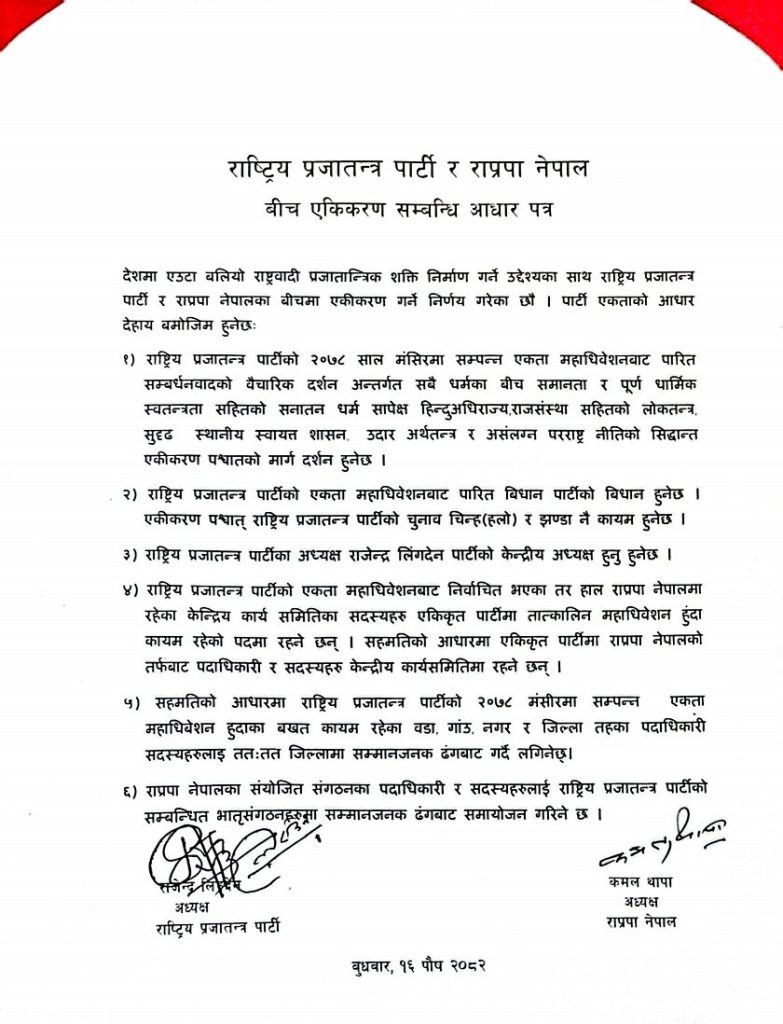 काठमाडौँ,१६ पुस । राष्ट्रिय प्रजातन्त्र पार्टी (राप्रपा) र राष्ट्रिय प्रजातन्त्र पार्टी नेपालबीच एकता भएको छ। बुधबार दुबै दलले ६ बुँदे एकता सम्झौतामा हस्ताक्षर गर्दै औपचारिक रूपमा एकीकरणको घोषणा गरेका हुन्।