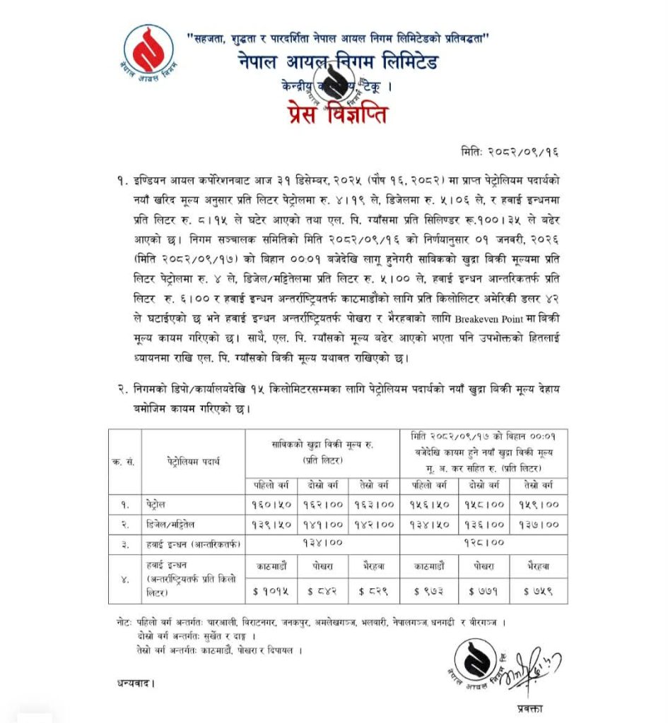 काठमाडौँ, १६ पुस । नेपाल आयल निगमले पेट्रोलियम पदार्थको मूल्य समायोजन गरेको छ। निगमले आज राति १२ बजेदेखि लागू हुने गरी पेट्रोल, डिजेल/मट्टितेल र हवाई इन्धनको मूल्य घटाएको हो।