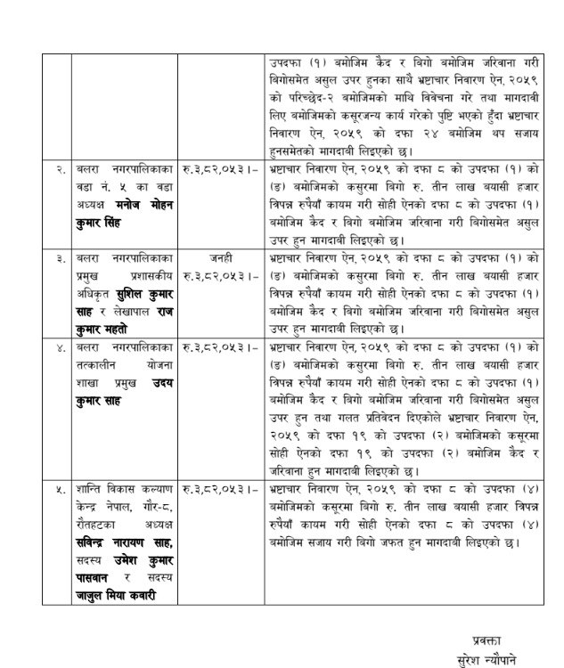 आयोगले बुधबार बलरा नगरपालिकाका प्रमुख प्रशासकीय अधिकृत सुशील कुमार साह, नगर प्रमुख रामा शंकर प्रसाद कुशवाहा, वडाध्यक्ष मनोज मोहन कुमार सिंह, योजना शाखा प्रमुख उदय कुमार साह, सहायक लेखापाल राज कुमार महतोसहित आठ जनाविरुद्ध भ्रष्टाचार मुद्दा दायर गरेको हो।