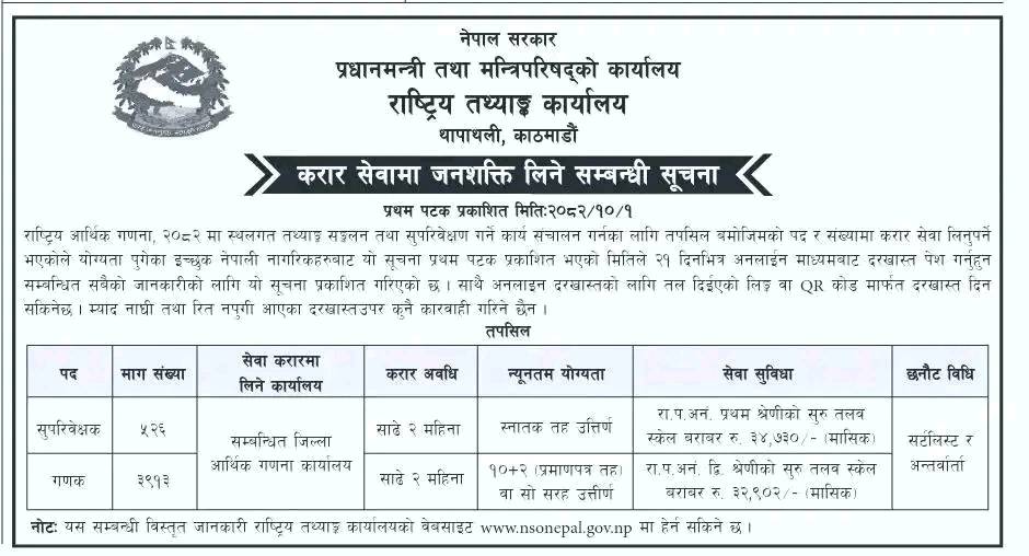 कार्यालयले सूचना प्रकाशित गर्दै स्थलगत तथ्याङ्क सङ्कलन तथा सुपरिवेक्षण कार्यका लागि ५२६ जना सुपरिवेक्षक र ३ हजार ९१३ जना गणक आवश्यक रहेको जनाएको हो।