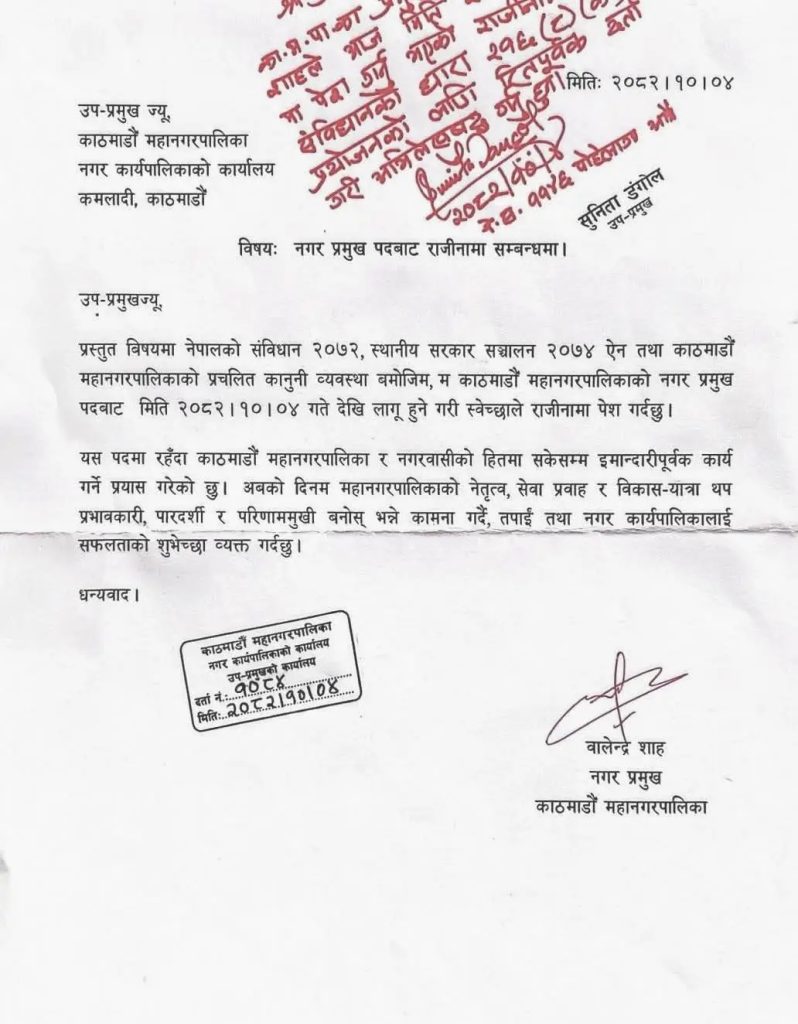 नेपालको संविधान २०७२, स्थानीय सरकार सञ्चालन ऐन २०७४ तथा काठमाडौँ महानगरपालिकाको प्रचलित कानुनी व्यवस्था बमोजिम आजैदेखि लागू हुने गरी स्वेच्छाले राजीनामा दिएको पत्रमा उल्लेख गरिएको छ।