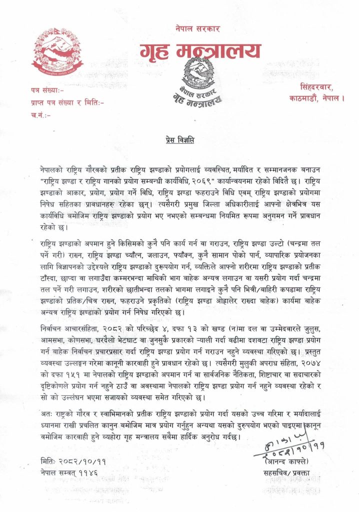 गृह मन्त्रालयद्वारा जारी प्रेस विज्ञप्तिमा “राष्ट्रिय झण्डा र राष्ट्रिय गानको प्रयोग सम्बन्धी कार्यविधि, २०६९” कार्यान्वयनमा रहेको स्मरण गराउँदै राष्ट्रिय झण्डाको आकार, प्रयोग विधि, फहराउने तरिका तथा निषेधित कार्यहरू स्पष्ट रूपमा उल्लेख गरिएको छ। सो कार्यविधि बमोजिम प्रमुख जिल्ला अधिकारीलाई आ–आफ्नो क्षेत्रमा राष्ट्रिय झण्डाको प्रयोगबारे नियमित अनुगमन गर्ने जिम्मेवारी तोकिएको छ।