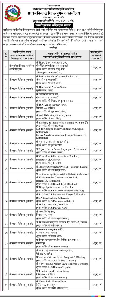 काठमाडौँ,२ फागुन । विभिन्न निर्माण कम्पनी सरकारको कालोसूचीम परेका छन् । प्रधानमन्त्री तथा मन्त्रिपरिषद्को कार्यालय मातहत रहेको सार्वजनिक खरिद अनुगमन कार्यालयले २० वटा निर्माण कम्पनीलाई कालोसूचीमा राखेको छ। कार्यालयले शनिवार सूचना जारी गर्दै विभिन्न सरकारी निकायको सिफारिसका आधारमा ती कम्पनीलाई कालोसूचीमा समावेश गरिएको जनाएको हो।