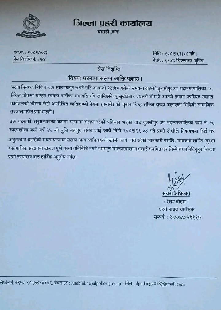 बिहिबार राति ९ः३० बजे राष्ट्रिय स्वतन्त्र पार्टीका सभापति रवि लामिछानेको दाङ आगमनका क्रममा आयोजित स्वागत कार्यक्रममा भीडभाडका बीच केही व्यक्तिले नेपाल कम्युनिष्ट पार्टी (एमाले)को झण्डा जलाएको भिडियो सामाजिक सञ्जालमा सार्वजनिक भएको थियो।