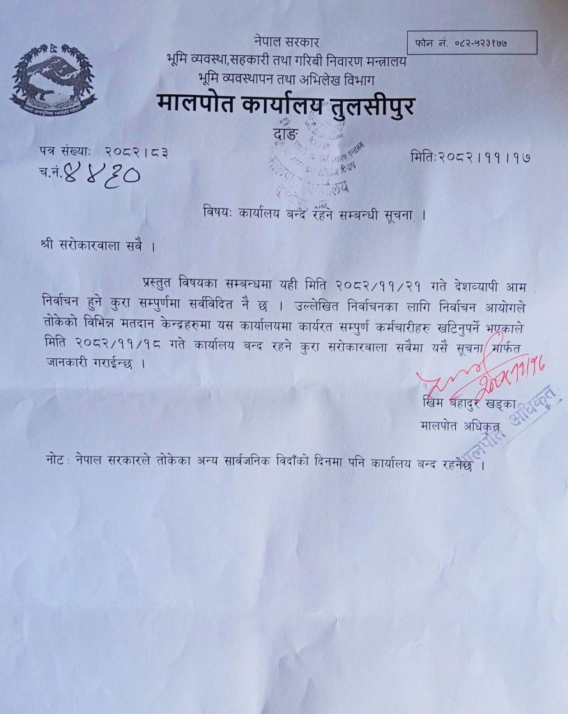 दाङ,१७ फागुन। मालपोत कार्यालय तुलसीपुर भोलि एक दिनका लागि बन्द रहने भएको छ।