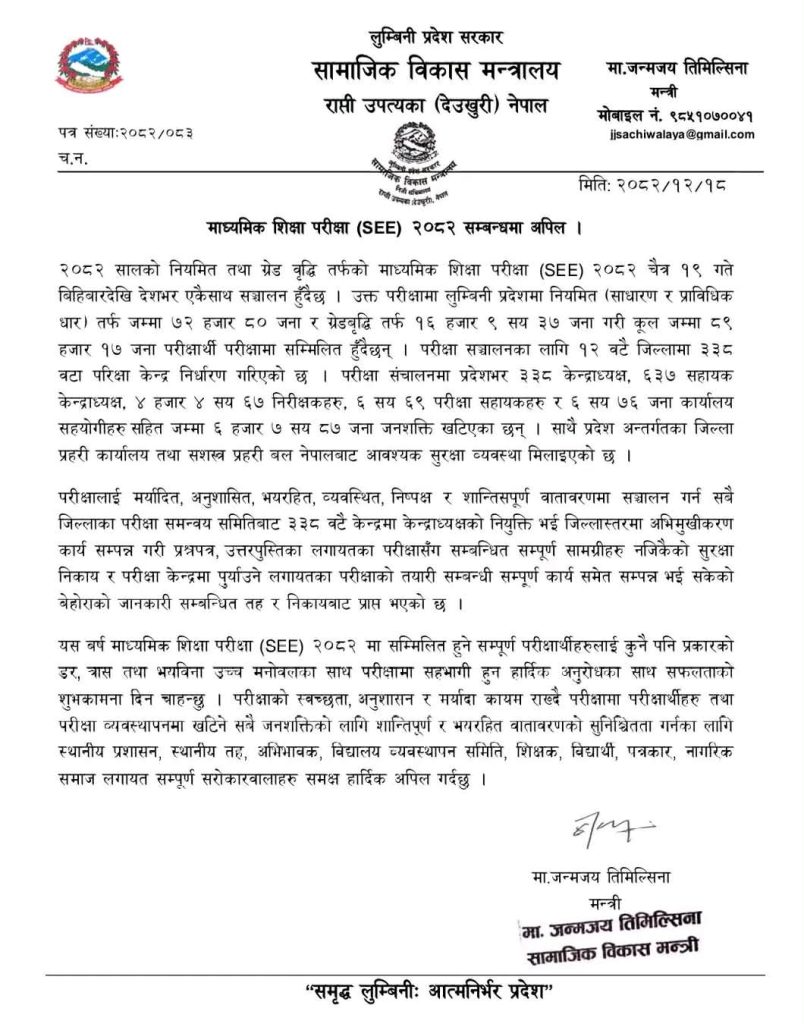 लुम्बिनी प्रदेश सरकारका सामाजिक विकास मन्त्री जन्मजय तिमिल्सिनाले परीक्षार्थीहरूलाई डर, त्रास वा कुनै दबाबबिना उच्च मनोबलका साथ परीक्षा दिन आग्रह गर्दै सफलताको शुभकामना व्यक्त गर्नुभएको छ। उहाँले स्थानीय प्रशासन, स्थानीय तह, अभिभावक, विद्यालय व्यवस्थापन समिति, शिक्षक, विद्यार्थी, पत्रकार तथा नागरिक समाजलाई परीक्षा स्वच्छ, अनुशासित, भयरहित र निष्पक्ष वातावरणमा सम्पन्न गराउन सहयोग गर्न अपिल गर्नुभएको छ।