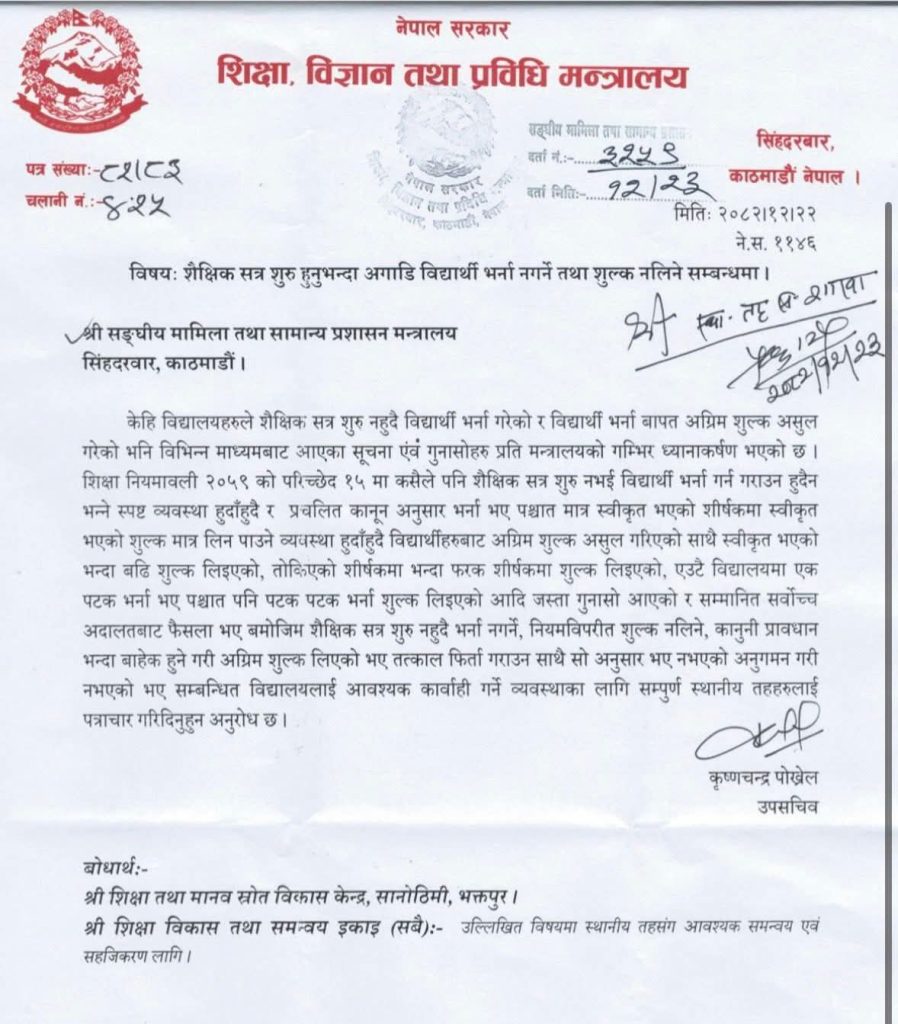 साथै नियमविपरीत उठाइएको अग्रिम शुल्क तत्काल फिर्ता गराउन पनि निर्देशन दिइएको छ। निर्देशन अवज्ञा गर्ने विद्यालयलाई कानुनअनुसार कारबाही गरिने मन्त्रालयले चेतावनी दिएको छ।